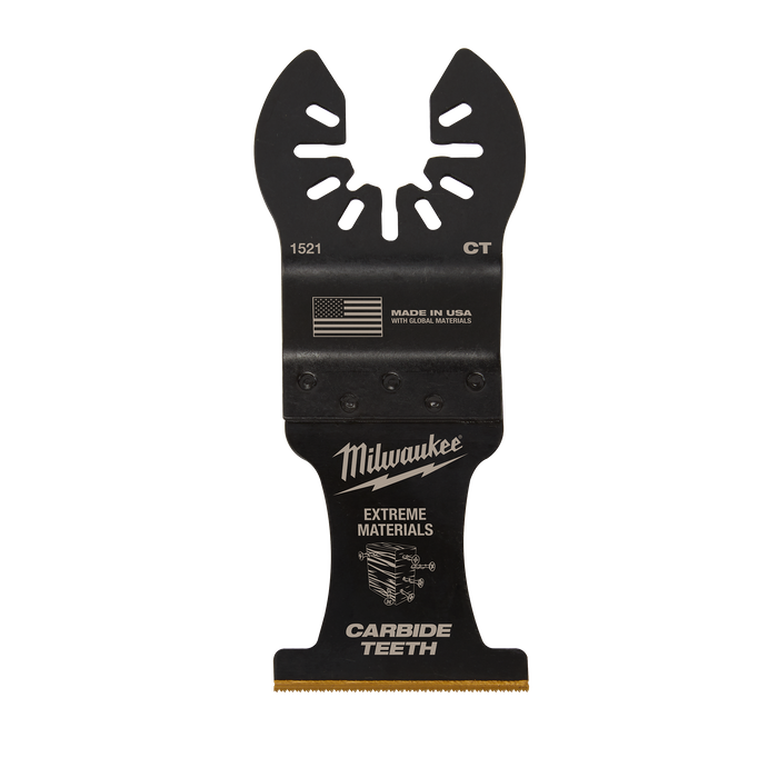 The Milwaukee Universal Fit OPEN-LOK™ Titanium Enhanced Carbide Teeth EXTREME Materials Blades for Oscillating Multi-Tools are designed for use in the most Extreme material cutting applications. For use in wood, screws, nails, cement board, plaster, and other cutting applications, the Titanium Enhanced Carbide Teeth Extreme Materials Blade is complete with a thinner blade and unique aggressive tooth design that offers faster cutting performance in wood when compared to the standard carbide blade. The Extreme Materials Carbide Teeth Blade lasts up to 50X longer than standard bi-metal blades and can be used in a wide range of materials. These Milwaukee multi-tool blades are designed and made in the USA with global materials.