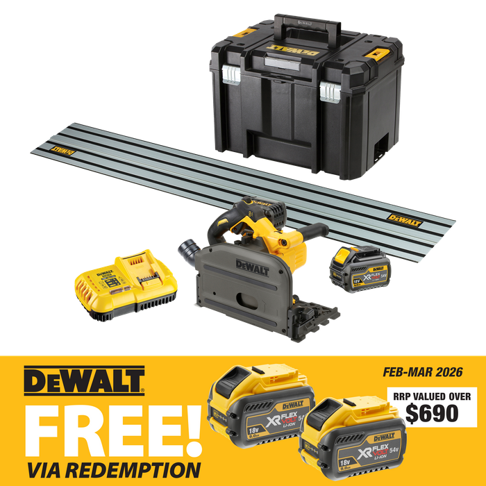 42 tooth precision circular saw blade, T-STAK Case, 2 x XR FlexVolt 54v 6ah Batteries, Battery Charger and 1.5m Rail
