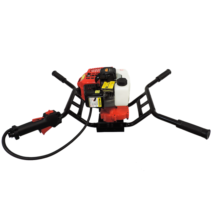 The 82cc 2 stroke engine features decompressor and easy start pull cord to help starting due to high compression of the engine this coupled with the double reduction gearbox offers a huge amount of torque hence the reason we recomend you need two persons to operate this post hole borer.