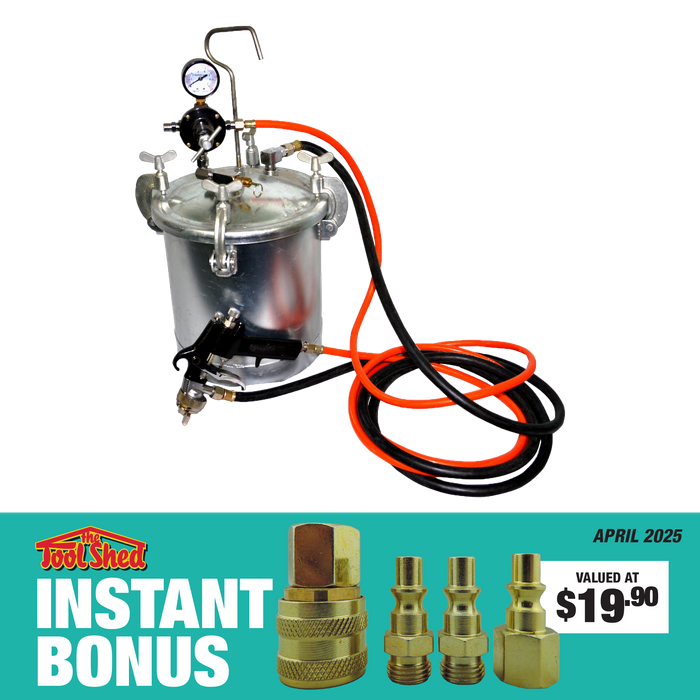 This very affordable unit holds up to 10 litres of paint or a 4 litre tin of paint that can be stood inside it. It comes complete with an air pressure gauge, safety valve and fluid outlet. While it also features with a 2.5m air inlet hose and a 2.7m hose from the pressure pot to the spray gun. The pressure regulator regulates the amount of pressure applied to the paint in the tank which in turn controls the pressure being delivered to the spray gun. The carry handle is also handy for hanging the pressure pot up to get at higher places. Normal operating pressure is between 25 to 30 PSI however the higher the gun is used above the pressure pot more pressure is required