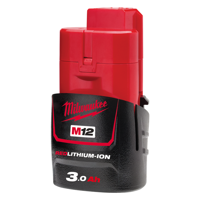 Delivers up to 3X more runtime, 20% more power and 2X more life than standard lithium-ion batteries. The M12™ 3.0 Ah REDLITHIUM-ION™ Compact Battery features superior pack construction, electronics and performance to deliver more work per charge and more work over the life of the pack than any battery on the market. With Milwaukee durability built into each pack, this battery runs cooler and performs in climates below 0°F/-18°C. Its compact design fits in tight work spaces and reduces user fatigue. Managed by Milwaukee's exclusive REDLINK™ Intelligence, the battery features overload protection to prevent you from damaging your cordless power tools in heavy-duty situations, while the discharge protection prevents cell damage. The temperature management system and individual cell monitoring help maximize battery life. Upgrade to the M12™ 3.0 Ah REDLITHIUM-ION™ Compact Battery to instantly increase the runtime and durability of your Milwaukee M12 cordless tools.