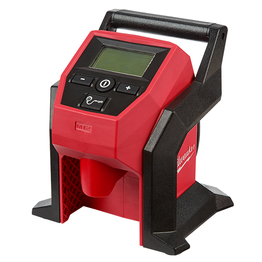 The Milwaukee® M12™ Compact Inflator delivers fast, accurate, easy inflation with the portability to take anywhere. The inflator has the capability to complete demanding applications like car, LT truck, and compact equipment tyres, the M12™ Compact Inflator gives users ultimate power and efficiency. Rated to deliver over 120PSI, The high efficiency motor and pump top-off car tyres in under 1 minute. The TrueFill™ Auto shut-off technology delivers highly accurate pressure, protects from overfill, and automatically senses speed of fill to deliver precise shut-off at the desired PSI. Additionally, the unit includes a large easy to read back-lit LCD, anti-vibration feet, and 66cm hose with an all brass Schrader chuck.