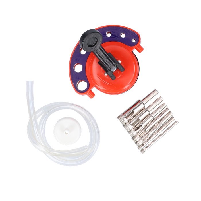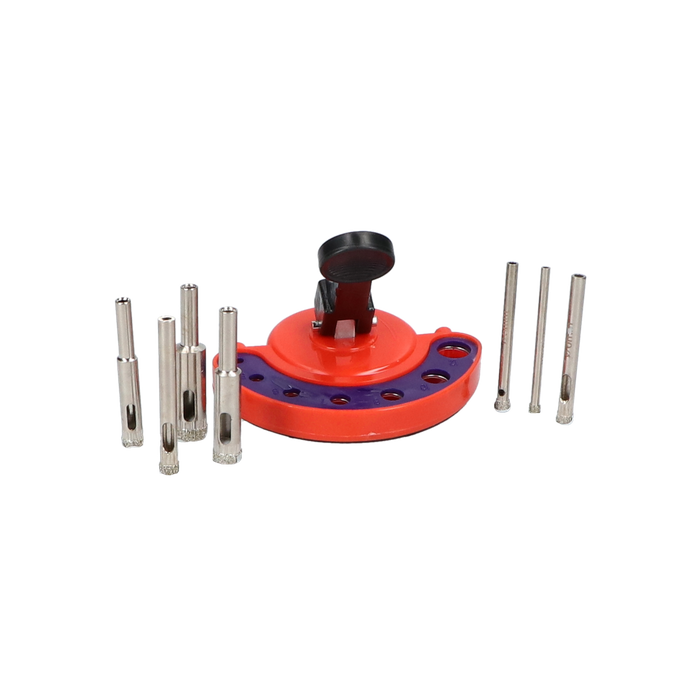 This kit comes complete with 7 different sizes including 4, 5, 6, 7, 8, 10 and 12mm. Also includes the suction cup drill guide, and a water hose to be connected to a bottle which keeps the area being drilled wet, reducing dust and increasing the life of the drill bits.