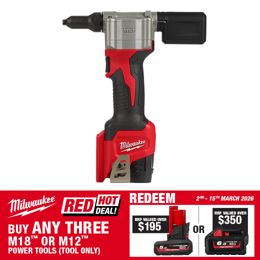 The M12™ Pop Rivet Tool is a cordless solution that delivers fast, easy riveting while maintaining performance, durability, and size. The M12BPRT-0 can pull up to 500 3/16" stainless steel rivets or 900 1/8" steel rivets on one charge with a 3.0Ah battery, and reduces muscle effort from a hand tool by 65%. No compressors or hoses during set up and operation makes this tool a great replacement to pneumatic products. Delivers maximum durability from common jobsite conditions and use. This is the most compact cordless rivet tool on the market, measuring only 165mm in length allowing users more access in tight spaces. The M12™ Pop Rivet Tool is part of the M12™ battery platform, offering 50+ solutions on one battery system.