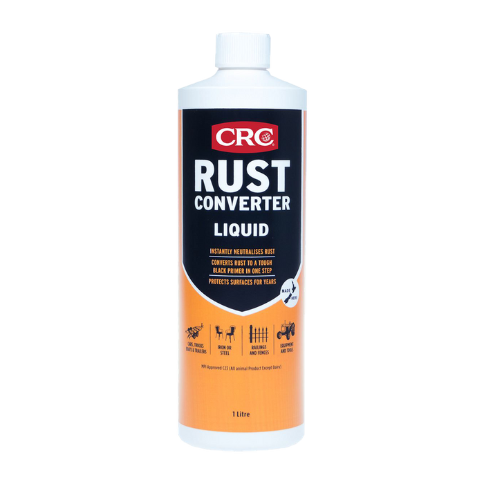 CRC Rust Converter is a unique fast drying coating formulated for treatment of lightly rusted or correctly prepared metal surfaces. CRC Rust Converter neutralises rust and converts it to a tough black primer in one easy step. It binds to the surface and provides a waterproof barrier by sealing out moisture and other outside elements for effective long-lasting rust protection. No more sandblasting, heavy scraping, or grinding.