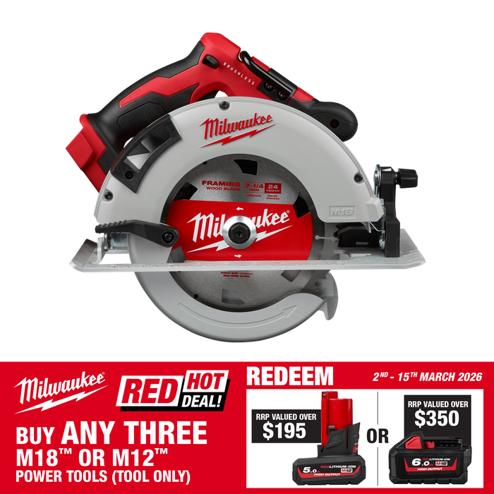 M18™ Brushless 184mm Circular Saw delivers maximum power in a brushless motor while providing more run-time. The Milwaukee® built motor and REDLINK™ electronics provide more efficient power delivery, more power and fewer trips to the charger. With 5,000 RPM the M18BLCS66-0 provides smooth cutting, and at only 3.3kg, it is lighter than most corded saws. The 184mm Brushless Circular Saw also features an integrated rafter hook, magnesium guards, an aluminum shoe and LED light.
