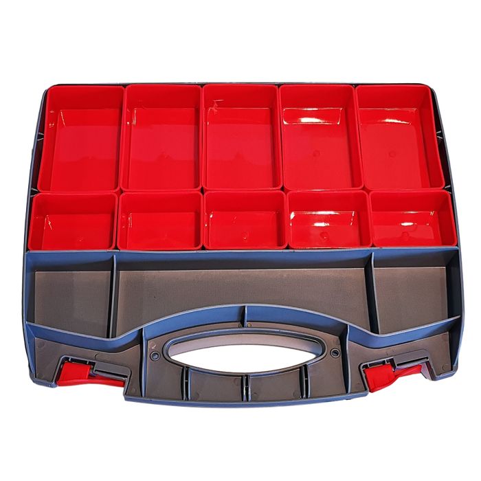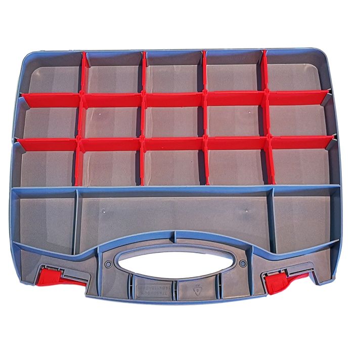This storage container is double sided with latch down lids. One side features 3 fixed compartments and 5 small and 5 large removable compartments, the other side features 3 fixed compartments and 15 at the back that have sliders to arrange the compartments to the size you need.
