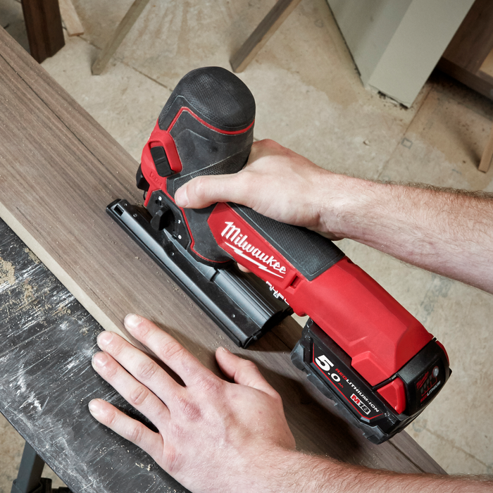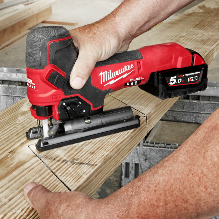 The M18 FUEL Barrel Grip Jigsaw combines power, blade speed and precision, to provide the highest quality cuts in a wide variety of materials. The M18 FUEL Barrel Grip Jigsaw leverages the POWERSTATE Brushless Motor and REDLINK PLUS Intelligence to provide higher blade speed than corded jigsaws at 3500 strokes per minute for clean controlled cuts with minimised chipping or bucking. Leveraging the M18 REDLITHIUM-ION 5.0Ah battery the M18 FUEL Barrel Grip Jigsaw provides up to 32m of cutting in 19mm laminated particle board, delivering all day productivity with less trips to the charger. The saw features tool-less blade change, tool free bevel adjust with detents at 0°; 15°; 30°; and 45° as well as an LED light and on/off blower to keep the cut line visible while cutting.