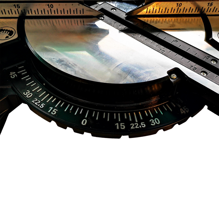 It features a full cast aluminium base and frame that is very light and strong, this machine will bevel left 45deg and mitre left and right up to 45 degrees plus has positive mitre stops at all the common angles, this eliminates any movement in the base between cuts. The two side extension tables offer extra support for those longer lengths of timber such as decking framing etc.
