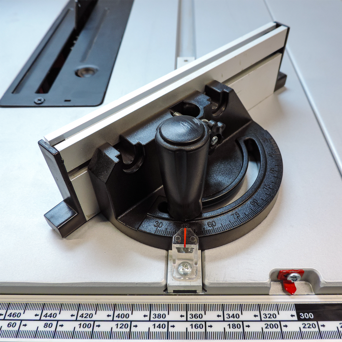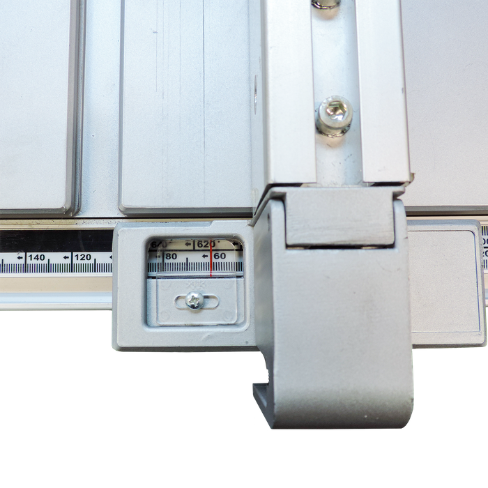 Comes complete with a sturdy aluminum ripping fence which clamps at the front and the back so there is no chance of the fence moving while cutting. The fence also has a low profile extrusion which gets closer to the blade for those smaller more precise rips. With the use of the extension arms a maximum rip to the right with the fence is of 610mm can be achieved.