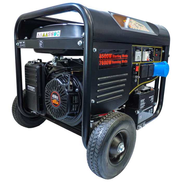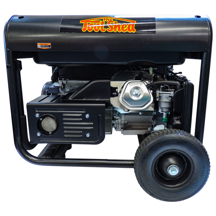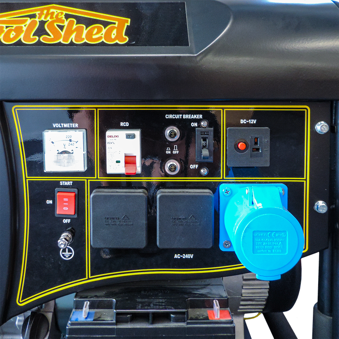 The ToolShed 8.5 kVA Generator is designed to peak at 8.5kVA and is fitted with AVR (automatic voltage regulator) to supply a more constant power supply even when under load. This generator is powered by a very reliable 4 stroke OHV petrol engine which has electric start. A 12V charging facility is also a handy feature along with a large 25L fuel tank for extra run time between fills. It is suitable for products, such as microwaves, that don't like voltage fluctuations (not suitable for sensitive electronic equipment such as computers). The ToolShed 8.5kVA Generator is ideal for larger power draw items such as compressors and welders when used on site, as it offers that higher peak current which is needed to start those larger machines. The generator is also fitted with a residual current device (RCD) for greater electrical safety and a heavy duty 32-amp single phase outlet to connect larger machines to. It is also fitted with 2x 15-amp outlets. The ToolShed 8.5kVA generator also features a very strong roll protection cage, solid rubber tyres and fold out handle. This makes it easier to manoeuvre, while helping keep the running noise down and helping protect it from getting damaged.