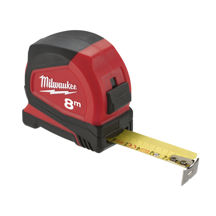MILWAUKEE Compact Tape Measures are Nothing But Heavy Duty. Featuring nylon bond blade protection and a 5-point reinforced frame, they offer heavy duty durability by resisting contamination wear and impact resistance. To increase productivity on the job site, they are 30% more compact than MILWAUKEE General Contractor Tapes and have an optimized hook designed for scoring. For added utility, MILWAUKEE's new Compact Tape Measures also have stamped steel belt clips and are lanyard ready