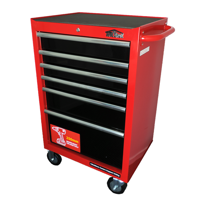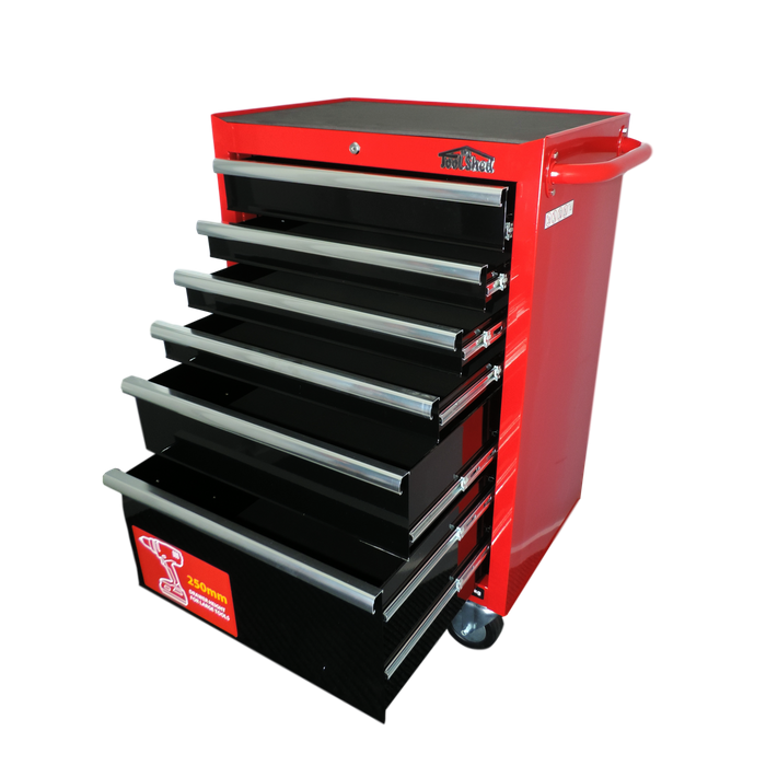This amazing roller cabinet features 6 drawers all with ball bearing slides and a soft closing function with a rating of 23Kg per drawer. All 6 drawers measure 560mm wide and 400mm deep. The top 3 drawers measure 75mm high with the following being 100, 160 and 270mm.