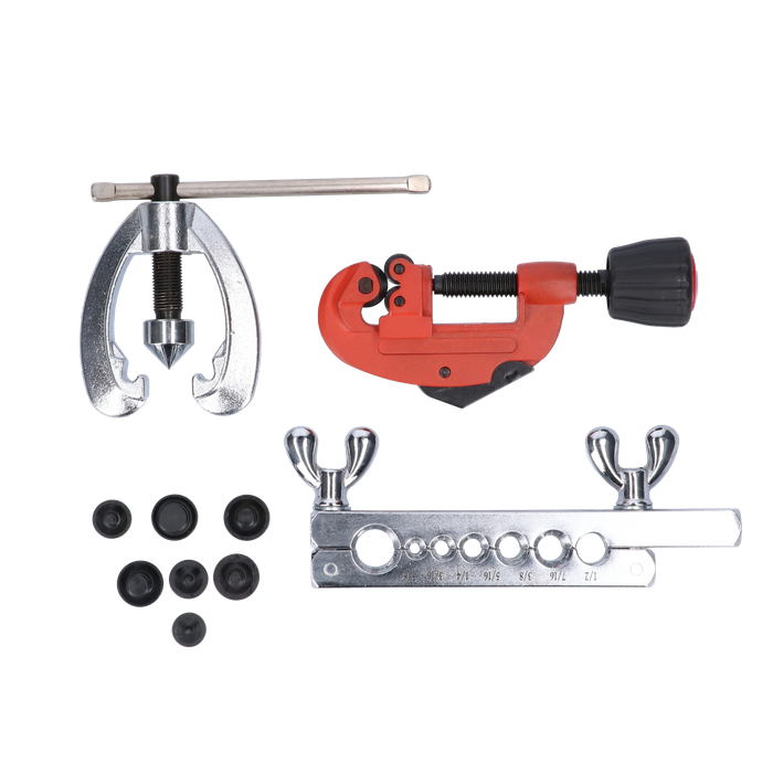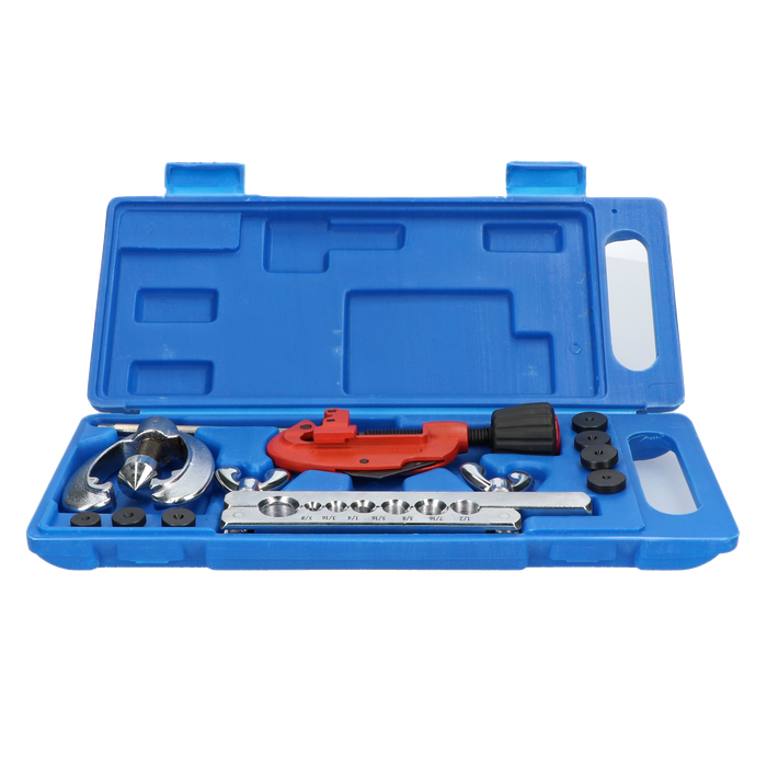 This kit features the ability to flare the following imperial sizes - 3/16", 1/4", 5/16", 3/8", 7/16", 1/2", 5/8". It also features a robust cast bodied tube cutter with hardened cutters that will cut 3mm to 30mm diameter pipe complete with a built-in deburring tool.