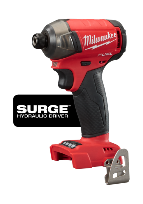 The M18 FUEL™ SURGE™ 1/4" Hex Hydraulic Driver is the quietest cordless fastening solution on the market. With Milwaukee's new FLUID-DRIVE™ Hydraulic Powertrain, users will experience up to 50% quieter operation, 3X less vibration for smoother operation, and faster driving speeds compared to standard impacts. The POWERSTATE™ Brushless Motor delivers up to 0-3,000 RPM with constant power output to drive screws faster. REDLINK PLUS™ Intelligence is the most advanced electronic system on the market, preventing damage to the tool and battery caused by overloading or overheating. For use with REDLITHIUM™ Compact Batteries or Extended Capacity Batteries (sold separately), which deliver more work per charge and more work over the life of the pack than competitive batteries on the market. The 4-Mode DRIVE CONTROL™ provides greater control over output speed and power for greater versatility. Self-Tapping Screw Mode is designed to reduce walking when starting self-tapping screws as well as reduce overdriving, breaking and stripping out screws.