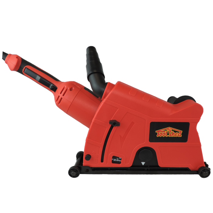 The base of the shroud has 4 small wheels so it will roll along the cutting surface smoothely, plus the guard is height adjustable to vary the cutting depth from 0-60mm and included is a side handle that attached to the top of the guard making this very comfortable to hold and use.