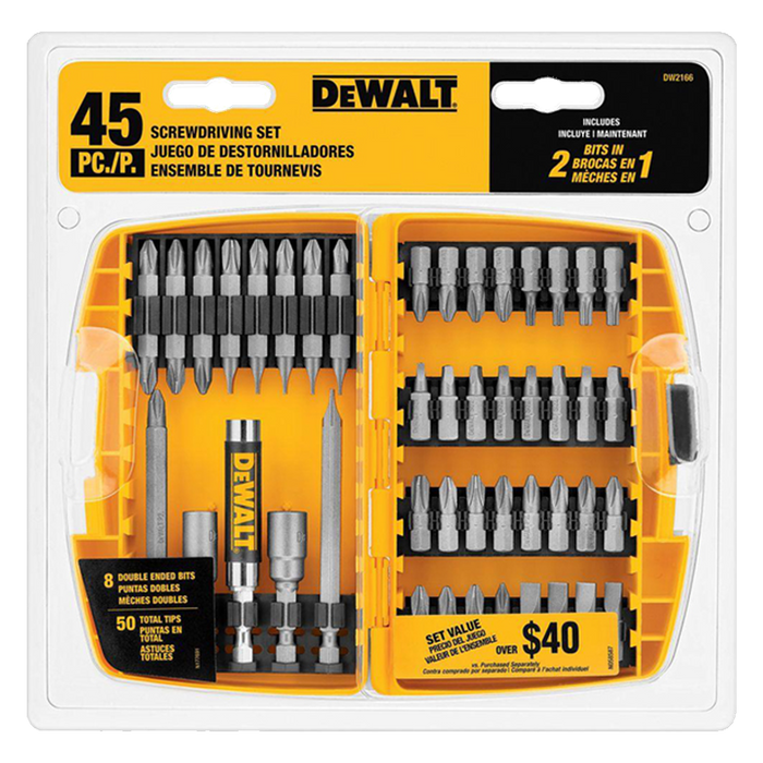 - The set includes Phillips, square, slotted, and double-ended bits.