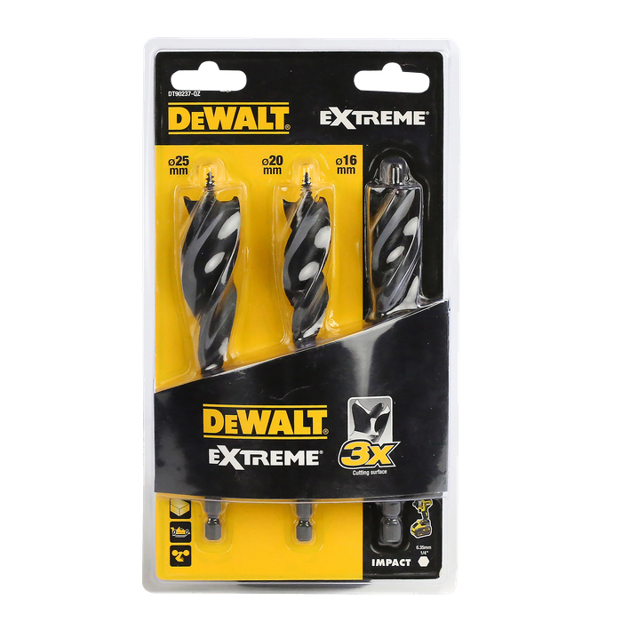 DeWALT DT90237 3 Flute Spade Bit Set 3pce 1/4" hex shank impact rated spade drills suitable for use with corded and cordless Drill Drivers and now with Impact Drivers. This DT90237 DeWALT Spade Drill Set drills holes to 100mm through wood with an overall length of 152mm. Features include high quality impact rated spade bits, 3 flute tapered design removes chips more efficiently giving cleaner faster hole cutting. Self feed full screw tips allow fast easy use plus the 1/4" hex shank allows these DeWALT Spade Bits to be fitted to a number of machines