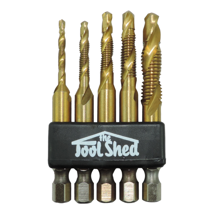 The ToolShed Drill and Tap set consists of 5 drill bits that also have the tap incorporated on the drill shaft. This means you can drill your hole and then tap it in one motion without having to change bits or select the correct size drill bit etc. Manufactured from high quality M2 steel the set includes the following 5 sizes M3 x 0.5, M4 x 0.7, M5 x 0.8, M6 x 1.0, and M8 x 1.25.
