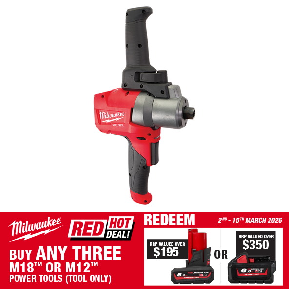 The M18 FUEL Mud Mixer is the industry’s first dedicated cordless solution that delivers the performance and durability to fully replace corded mixers. With the POWERSTATE Brushless motor it has the power to mix heavy compounds, such as concrete and mortar. Using our REDLINK Intelligence the variable speed dial, the variable speed trigger and the lock on button combine to give the user ultimate control for a consistent mix and cleaner working environment. With the M18 REDLITHIUM-ION battery, the user can mix up to 15 buckets on one 5.0Ah battery. The 180° adjustable handle is designed to allow every user to optimise the handle position for their comfort. This MILWAUKEE cordless solution increases productivity by eliminating the need for cords and allows the user to mix the material at the jobsite where it is being applied.