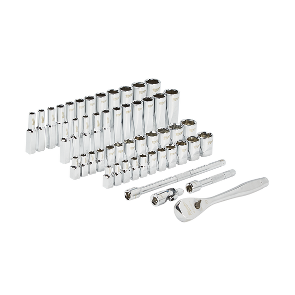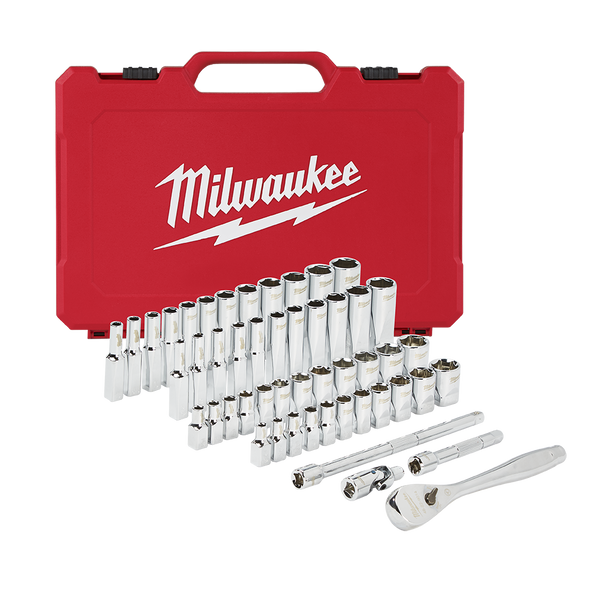 Our MILWAUKEE SAE & Metric 50 piece 1/4" drive Ratchet & Socket set is designed from the ground up, offering our users the Most Versatile Sockets that are Anti-Roll and Wrench-Ready. Its innovative FOUR FLAT Sides feature an anti-roll and wrench-ready design. The 90 tooth ratchet tool offers 4° of arc swing and a slim profile design, allowing you to work in tighter and more confined spaces, be it under the hood of a car or in the middle of a remodel. The ratchet and socket kit comes with a removable inner tray which is perfectly designed to be stored long-term in a steel storage chest. All of our sockets are stamped with SAE and metric measurements on the flat side for easy-to-read visibility. It also comes with a durable carrying case for ultimate portability. The set comes with accessories included so that our users can get every job done, both in the garage and on the jobsite. Our ratchet and socket set is backed by our Lifetime Guarantee.