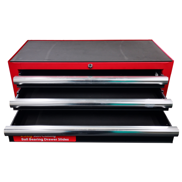 This tool chest features 3 drawers all with ball bearing slides all with a soft closing function and a massive rating of 23Kg per drawer. The 3 drawers all measure 575mm wide.