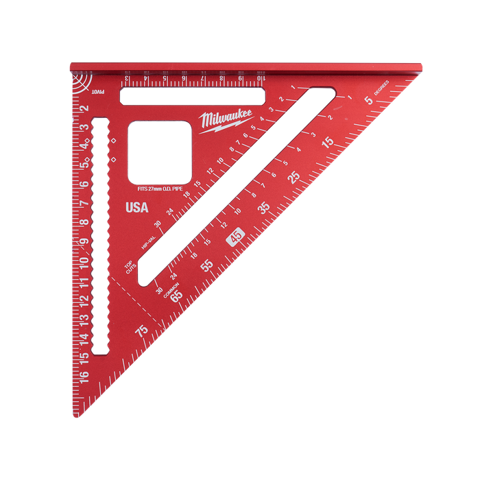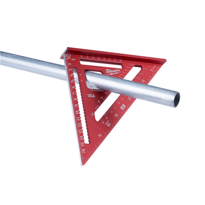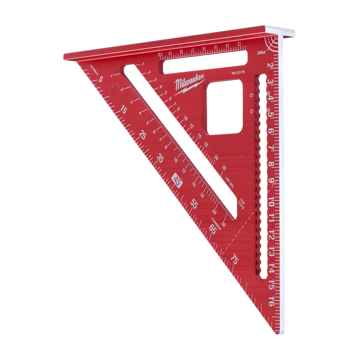 The Milwaukee 180mm Metric Rafter Square has a strong reinforced frame and provides the user with a high degree of versatility. Scribe notches from 25mm-145mm allow you to easily and accurately make precise measurments for cuts. A 25mm cutout in the rafter square helps prop pipe allowing you to cut it more easily on the job site. A reinforced frame gives you more durability on the job site while high visibility laser etched markings make the rafter layout square easier to read.