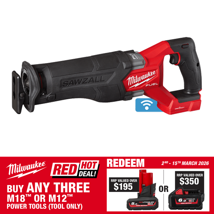 The M18 FUEL™ ONE-KEY™ SAWZALL™ Reciprocating Saw is the next generation of legendary performance and durability, designed for the toughest applications on the job site. The M18 FUEL™ ONE-KEY™ SAWZALL™ delivers fast cuts, as it leverages a POWERSTATE™ Brushless Motor to provide users with 3,000 SPM and 32 mm (1-1/4") stroke length for fast material removal. REDLINK™ PLUS Intelligence ensures maximum performance under stress, as well as protection from overloading, overheating, and over-discharging. The M18™ REDLITHIUM™-ION 5.0Ah Battery Pack (not included) delivers users runtime and provides more work per charge and more work over the life of the battery pack. The M18 FUEL™ ONE-KEY™ SAWZALL™ Reciprocating Saw is designed to perform in demanding applications and is Milwaukee's most durable cordless reciprocating saw yet. A tool-free, wear-resistant blade change reduces downtime on the job, and an anti-corrosion blade clamp and metal reinforced battery rails provide long component life, standing up to tough jobsite conditions. The M18 FUEL™ ONE-KEY™ SAWZALL™ Reciprocating Saw weighs less than the previous generation and features an adjustable shoe, integrated LED light, and a hanging hook for convenient storage on the job. Compatible with ONE-KEY™, users can wirelessly connect the reciprocating saw to a smartphone to customise, track, and manage the tool’s performance and location. Tool customisation allows users to control settings such as output speed and trigger ramp up for smooth cut starts. A selectable Cut Brake feature automatically stops the blade from reciprocating at the end of a cut, reducing the risk of damaging sensitive materials near the cut in most applications. The tool’s memory supports up to 3 custom profiles that can be easily accessed with the touch of a button on the tool. Integrated tool tracking, also available through ONE-KEY™, provides users full visibility to how and where tools are being used across their network of jobs and users.