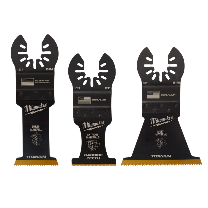The Milwaukee Universal Fit OPEN-LOK™ 3 Piece Multi-Material Multi-Tool Blade Variety Pack provides you with an assortment of top-performing blades in the three most common cutting applications. The Titanium Enhanced Carbide Teeth Blade is designed to last up to 50X longer in extreme metals compared to standard bi-metal blades, and are ideal for cutting Wood, Screws, Nails, Cement Board, Plaster, and more. The MILWAUKEE® Titanium Enhanced Bi-Metal blade uses premium high-speed steel and lasts up to 15X longer than standard High Carbon Steel blades. The bi-metal multi-tool blade is ideal for smooth cuts in wood with nails, PVC, and drywall, and comes with both 35mm and 63.5mm cutting width blades in this pack.