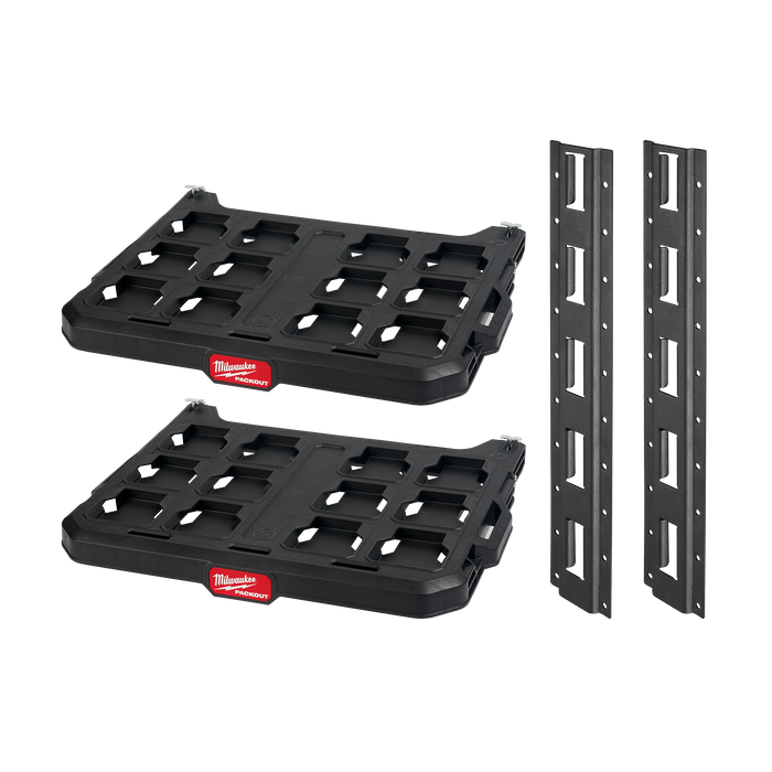 The Milwaukee PACKOUT™ Racking Kit includes two PACKOUT™ racking shelves and two 20" lengths of E-Track that allow you to attach and mount your racking system to a wide variety of surfaces: including your vans, trucks, trailers, garages, and shops. Featuring a metal reinforced frame and impact-resistant body, these tool storage racks have a 50 lbs weight capacity per shelf and allow you to customise and build a PACKOUT™ System that fits your needs. This Racking Kit is part of the MILWAUKEE® PACKOUT™ Modular Storage System, the industry's most durable and versatile storage system.