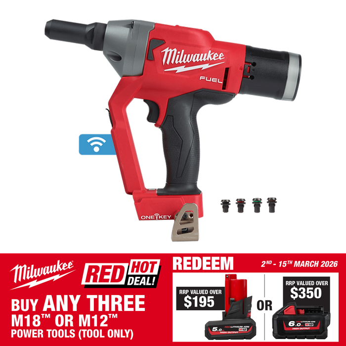 The M18 FUEL™ 1/4" Rivet Tool with ONE-KEY™ delivers fast cordless riveting. It eliminates the need for hoses and compressors while delivering maximum life. This rivet gun significantly increases productivity and portability, and ensures a higher level of safety. The premium steel alloy 3-jaw design delivers more work between jaw changes. While lightweight, the M18 FUEL™ 1/4" Rivet Tool with ONE-KEY™ has been designed to withstand harsh shop or assembly plant environments. Manufactured with an all-metal gearcase, impact strength plastics, and protective over-mold the tool is designed for maximum durability. The POWERSTATE™ Brushless Motor delivers 2,041 kg of pulling force for high strength blind rivets in all materials. This rivet tool pulls up to 900 3/16” (4.76 mm) aluminium or 500 1/4” (6.35 mm) aluminium blind rivets on one charge with an M18™ REDLITHIUM™-ION 2.0Ah battery (not included). REDLINK™ PLUS Intelligence ensures maximum performance and protects the tool and battery against overloads, over-heating, and over-discharge. With ONE-KEY™ compatibility, the tool allows the user to track and manage the tool within their inventory.