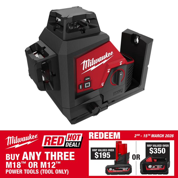 The M12™ 3 Plane Laser provides an all-in-one functionality with one horizontal line and two vertical lines for fast and easy alignment, leveling, squaring, and transfers allowing you to easily layout large spaces with one tool. Powered by our M12™ batteries, users will get 15hours of continuous run-time with a M12B4 battery pack for ultimate productivity. The high-intensity green laser ofers users superior visibility up to 38m for long-range applications. The integrated bracket features a micro control and pivots on plumb point for easy and fast alignment. The M12™ 3 Plane Laser features amplified rare earth magnets, providing a strong hold onto metal surfaces with the integrated screw and nail hang holes allowing easy and efcient setup in any environment.
