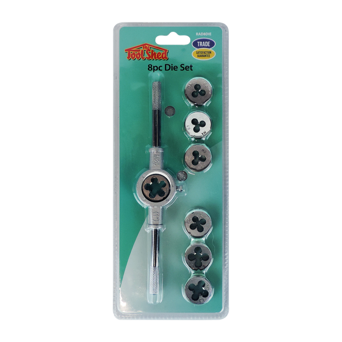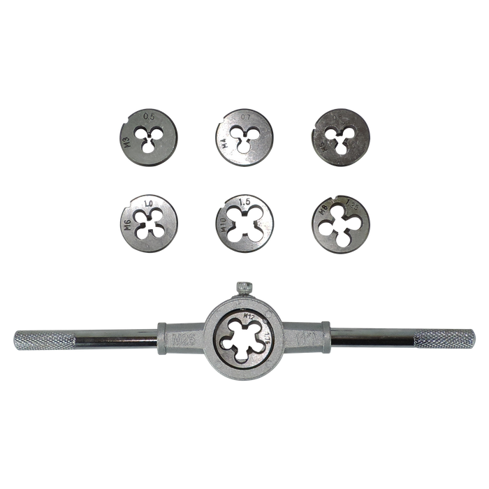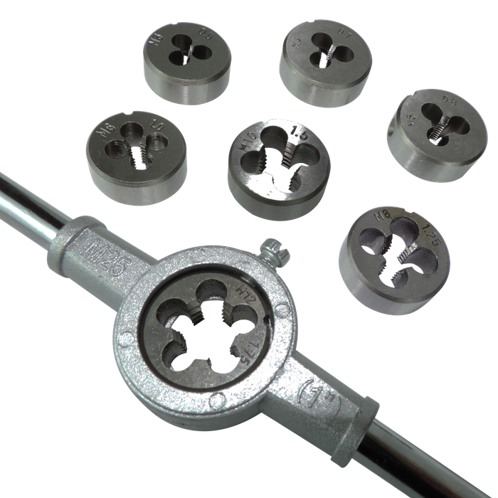 Includes 7 Dies - M3 x 0.5, M4 x 0.7, M5 x 0.8, M6 x 1.0, M8 x 1.25, M10 x 1.25, M12 x 1.75