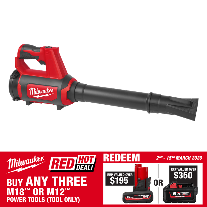 The M12™ Compact Blower delivers unrivaled power and performance on the M12™ platform. Boasting an air speed of 177 kph and up to 15 minutes of run-time, users will benefit from fast jobsite cleanup for maximum productivity. The axial fan design allows for 4.9 m³/min of air velocity, ensuring debris is cleared from hard-to-reach places. The M12™ Compact Blower also features a lightweight design and cruise control lock, reducing user fatigue. The M12BBL comes with three different attachments and is compatiable with all M12™ REDLITHIUM™-ION Batteries.