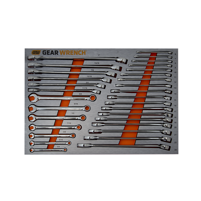 This quality GearWrench SAE/Metric Combination Long Pattern Wrench Set is supplied in a durable EVA tray for quick and easy transportation.