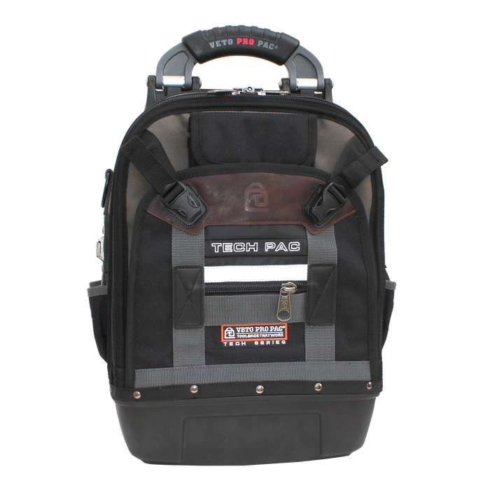 Designed to enable the safe and comfortable transport of a variety of tools when servicing equipment accessible by extension or cage ladders, or in cities or industrial buildings where walking long distances is required, the Tech Pac features Veto Pro Pac’s patented center panel, heavy duty construction and stabilizing injection molded waterproof base that keeps tools dry, even in the nastiest of conditions.