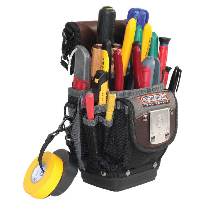 The TP3B is a Next Generation revised version of the TP3 with a Hard Bottom, extra tool pocket depth and riveted stainless steel tape measure clip. This service pouch stands up, bottom protected, and ready to help carry and help organize your most needed tools for any job or service call. It also has a streamlined metal clip on the back.