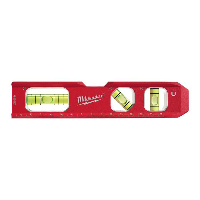 The MILWAUKEE Metric Billet Torpedo level features amplified rare earth magnets. The maximised viewing area ensures that the user can make a fast and accurate readings of 10mm and 20mm per meter in any position. The optimized top and back side pipe grooves make this the optimal tool for working with both small and large diameter pipes. The 48225207 MILWAUKEE billet level also offers a weld clearance and laser etched ruled edge.