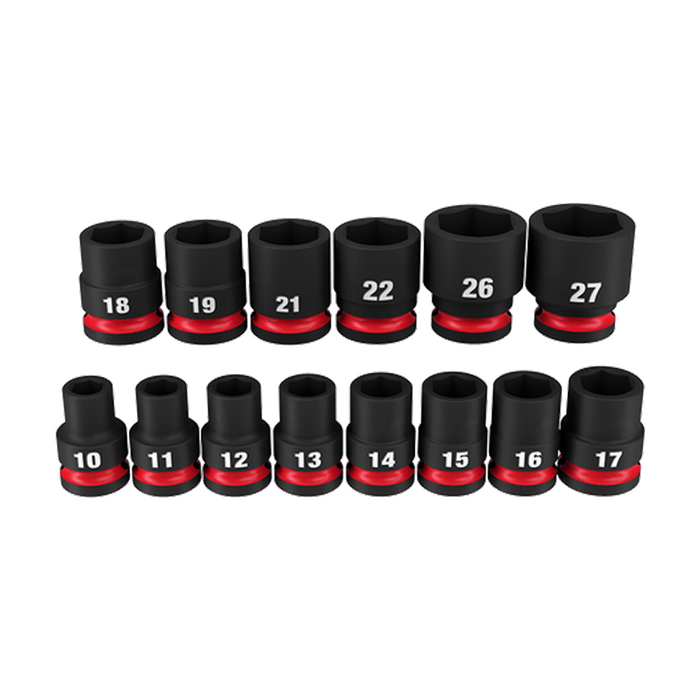 The MILWAUKEE® 14 Piece SHOCKWAVE Impact Duty™ 1/2" Drive Standard Socket Set features the boldest, longest-lasting markings and extreme impact durability in high torque applications. The stamped and ink-filled size markings make it easy to select the right socket every time throughout the life of the socket. Engineered with high strength forged steel for optimised performance in heavy-duty applications, and a non-slip hex geometry prevents fastener rounding. The dual-hole design and ring groove allow for easy socket attachment and removal. All SHOCKWAVE Impact Duty™ Sockets are backed by a Lifetime Guarantee and meet ASME industry standards.
