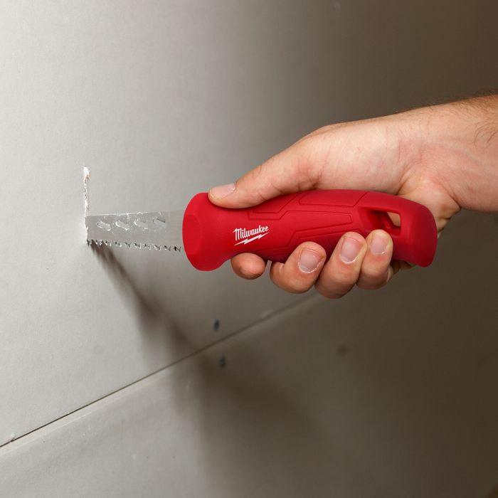 The MILWAUKEE Rasping Jab Saw is the only jab saw on the market to integrate rasping holes along the side of the blade to rapidly expand holes or smooth rough edges of sheetrock after a cut has been made. Complete with rubber over mold to increase comfort and reduce hand slippage, the new saw also features a thick 152mm (6”) plaster/drywall blade for increased durability and life