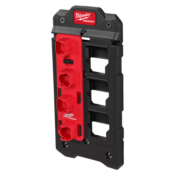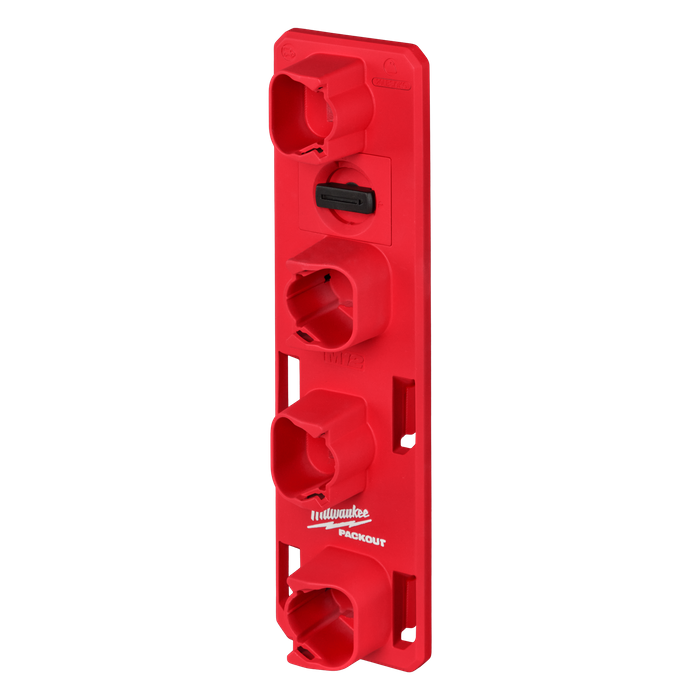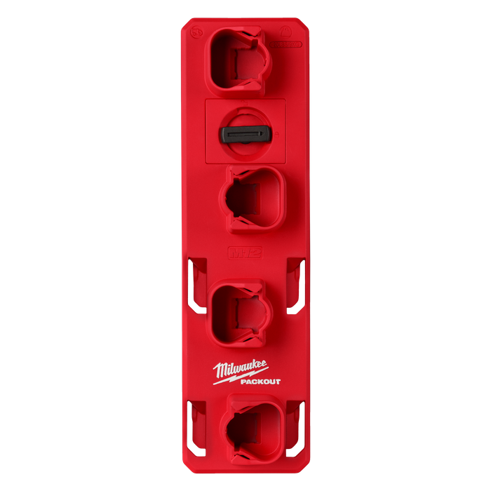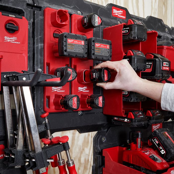 Fully customise your workshop, garage or vehicle with the PACKOUT™ M12™ Battery Rack. A secure clipping mechanism delivers strong and secure wall mounting that securely locks into all PACKOUT™ Mounting Plates. The PACKOUT™ M12™ Battery Rack fits up to four M12™ batteries of any size and has secure clip-in functionality that holds the batteries securely in place. Use in conjunction with other PACKOUT™ Hooks and Holders for a complete wall-mounted storage solution.