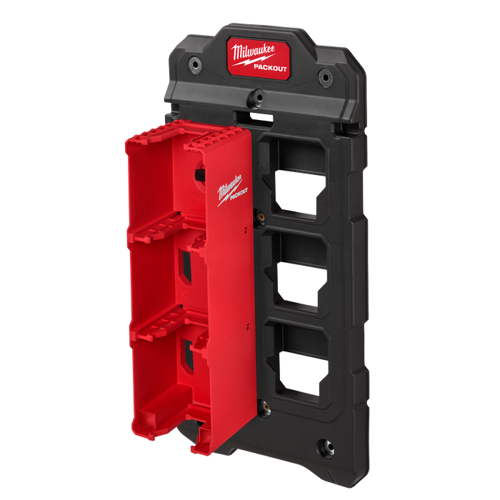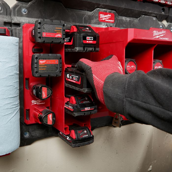 The Milwaukee PACKOUT™ M18™ Battery Rack delivers the most secure mounting when paired with PACKOUT™ Wall Plates. This Battery Rack features a clip-in battery storage to keep your batteries securely held in place and it is optimised to store up to four M18™ batteries of any size. Our Battery Rack features connectivity with PACKOUT™ solutions allowing you to fully customise your shop.