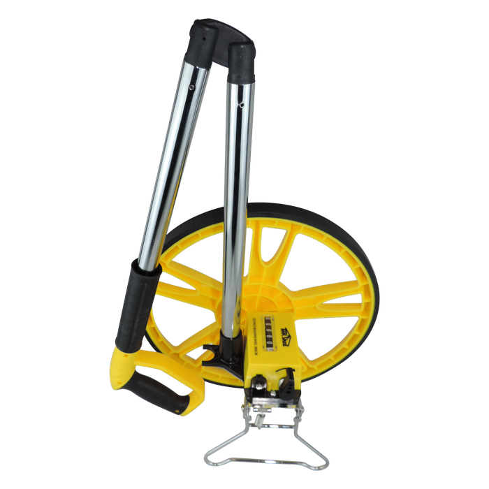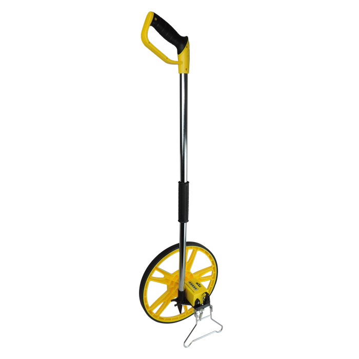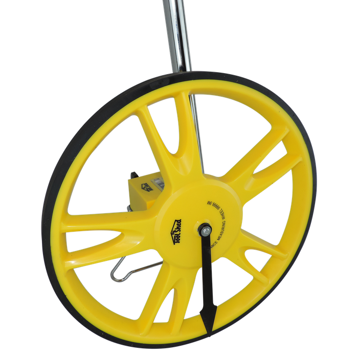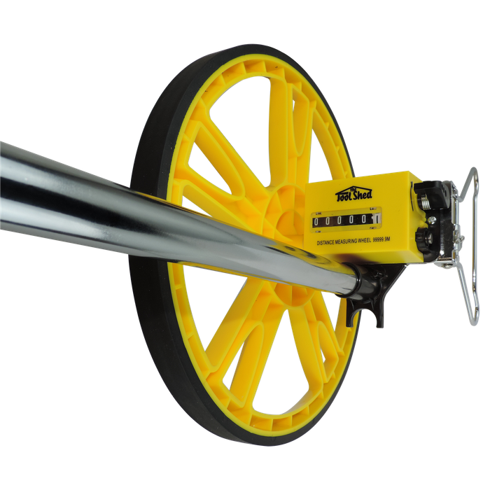 The ToolShed Distance Measuring Wheel is ideal for measuring larger areas and distances for civil construction, Land scaping, and drainage, to name a few. Features a telescopic handle with comfortable rubber hand grip and a fold down design that can easily fit into the back of a vehicle, The large 318mm rubber grip wheel can handle many different terrains such as dirt, concrete, and stone, and the large easy to read display can be reset to zero with the flick of a lever.
