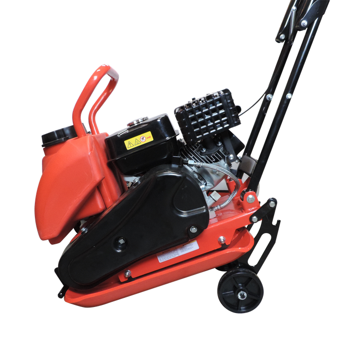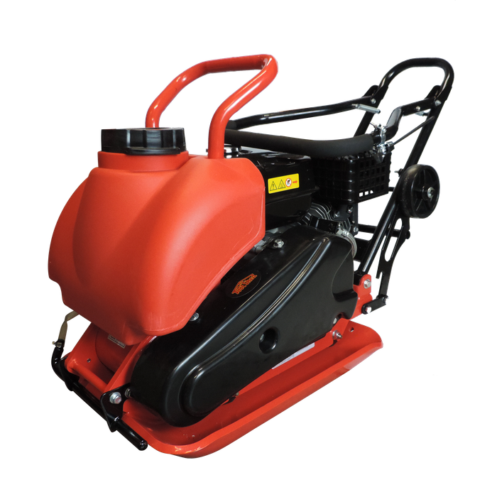 The ToolShed 80kg Plate Compactor is powered by a very reliable 7hp, easy to start, 4 stroke petrol engine. The centrifugal clutch helps control the idle and movement of the compactor, which has a forward speed of up to 15m per minute. The plate on this machine measures 540mm x 420mm. The exciter runs at 5,500 vibrations per minute, offering an output force of 13,000N. Handles are easily folded down for transport and are fitted with rubber shock absorbers for comfortable operation over longer periods. This compactor features wheels that fold under the machine, allowing you to move it around easily.
