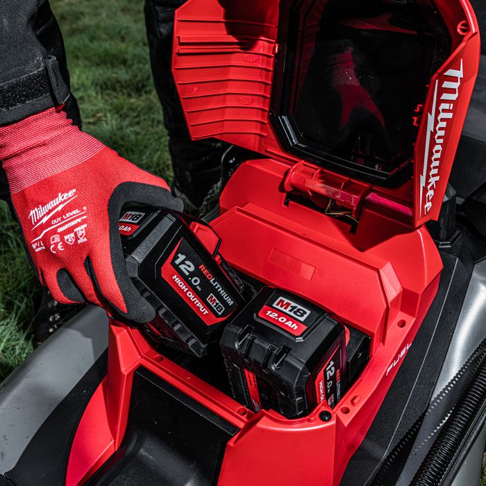 The lawn mower requires 2x M18™ REDLITHIUM™-ION Batteries for operation. When paired with 2x M18™ REDLITHIUM™-ION HIGH OUTPUT™ 12.0Ah Batteries (sold separately), the lawn mower delivers up to 60 minutes of runtime, allowing up to 2,000m2 of cutting while removing 15 mm of grass at a 4.8 km/h selfpropelled pace. With an infinitely variable self-propel speed dial, the lawn mower offers speeds between 0 - 6.4km/h, and the Active Speed Management Paddle allows user to easily adjust their walking pace in operation while maintaining complete control of the lawn mower.