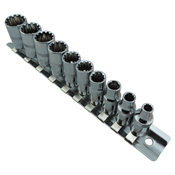 Constructed from chrome vanadium steel, this 10pc socket set includes sizes from 4–13mm. Spline sockets offer a smaller head than traditional sockets which gives you higher tensile strength and the ability to achieve higher torques. They allow for a larger contact area with your fasteners without damaging it or the corners of the socket. Extremely versatile, these spline sockets can be used on torx drives, square drives, 6 and 12-point drives, hexagonal fasteners, rusted and damaged fasteners, and spline fixings. These sockets come complete with a socket rail to keep them organised when you are storing them.