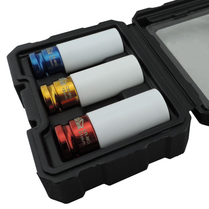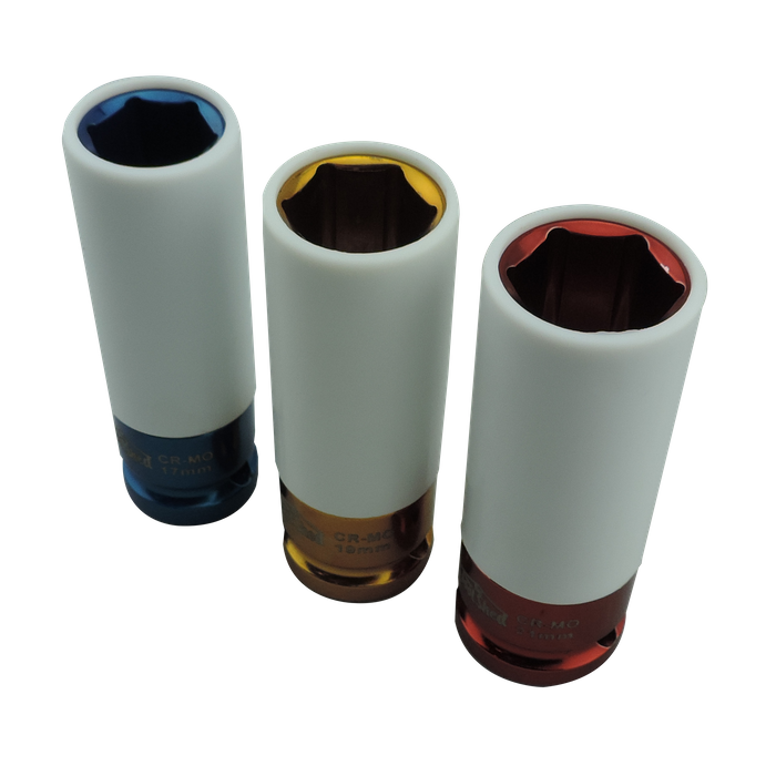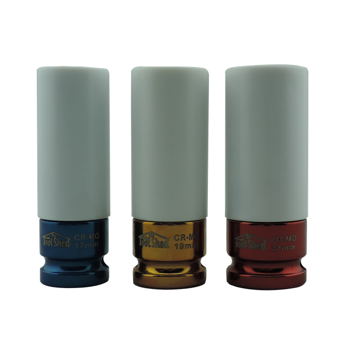 The ToolShed 1/2" Dr Wheel Nut Set is the perfect addition to the tool kit, coming with three sockets in 17, 19, and 21mm sizing. This durable set is made from strong chrome moly steel and has non-marking nylon casings to save you scratching those mag wheels. 1/2" square driven with a 6-point hex socket; each wheel nut socket is colour coded for quick identification while you work. This wheel nut set comes in a sturdy, blow moulded casing so that they store easily while being protected.