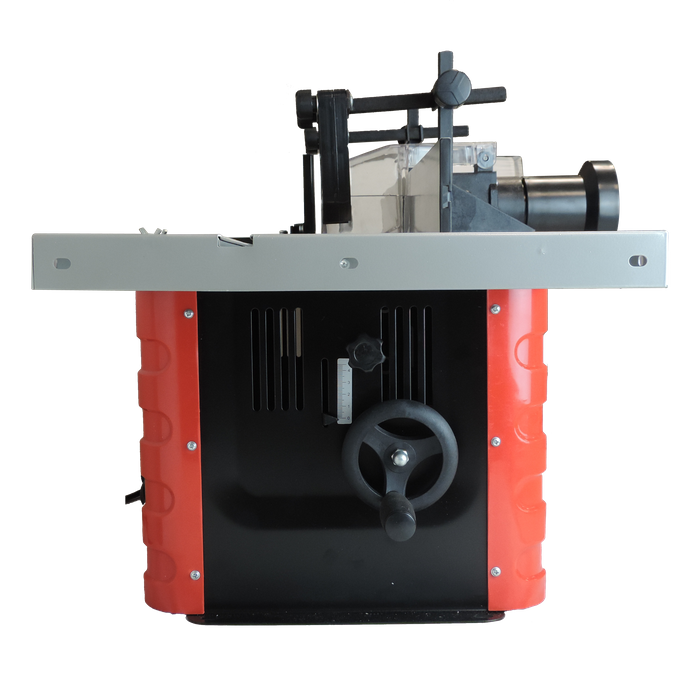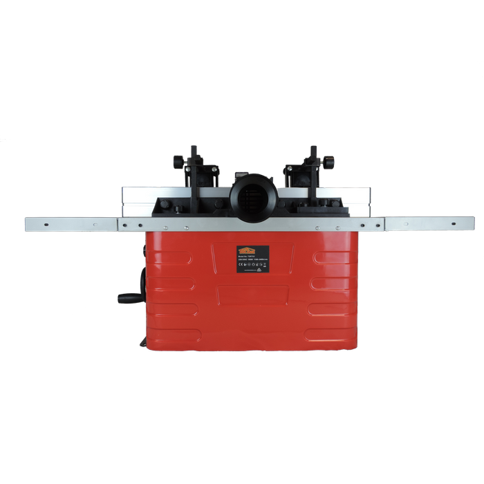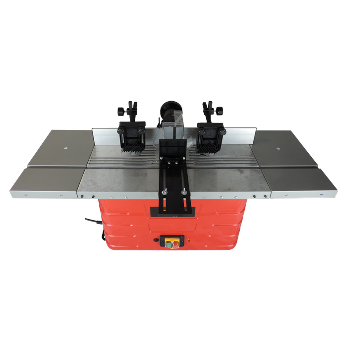 The ToolShed Router Table comes with a cast alloy table with pressed metal guards, adjustable fence, and table extensions. It also has 1/4" +1/2" collets so your router bits can fit into them. An adjustable mitre guide is also included, and a dust extraction chute is mounted behind the spindle ready to connect your unit to. This machine has the capability to raise or lower the spindle. Great for trenching, rebating, or running fancy moldings, this router table also has a fast stop safety switch fitted. This table router also has variable speed between 11500 - 24000RPM which makes it great for different materials.