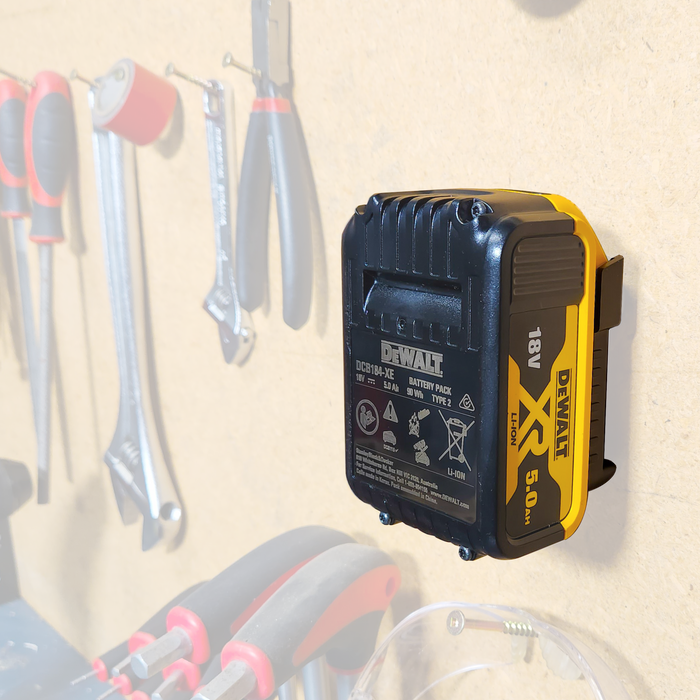 ToolShed battery holder mounts are the perfect accessory to keep your workshop organised and ensure you know where your batteries are when you need them. Compatible with Milwaukee 18V M18 and DEWALT 18V XR batteries (for Makita see TSBH01), these battery holders come in a pack of 4 and are perfect for a range of storage options. Simply use the included screws to mount the holder on your tool wall, below your work bench, or even in the work van so you can always find it first time. You can also loop your belt through these holders so that you can have a spare battery with you on the go. This is great when you’re working away from your vehicle or workshop, like on a roof, to keep you working without any hassle of looking for batteries.