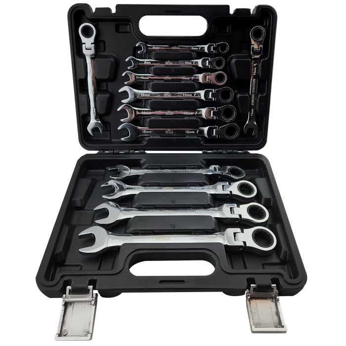 The ToolShed Flexi Head 12pc gear spanner set is a great set to have handy regardless of whether you are working at home or in the workshop. This professional set features 12 spanners that are constructed from chrome vanadium which makes them great at resisting rust. They feature an open end for all your usual applications, while the other end features a flexi head ratchet. This flexi head offers 180° of motion which allows you to reach those trickier places or awkward angles, perfect when getting to some of those bolts found on an engine. The sizes in the ToolShed Flexi Head spanner set range from 8-19mm and they all come in a blow moulded case for convenient organization and storage.